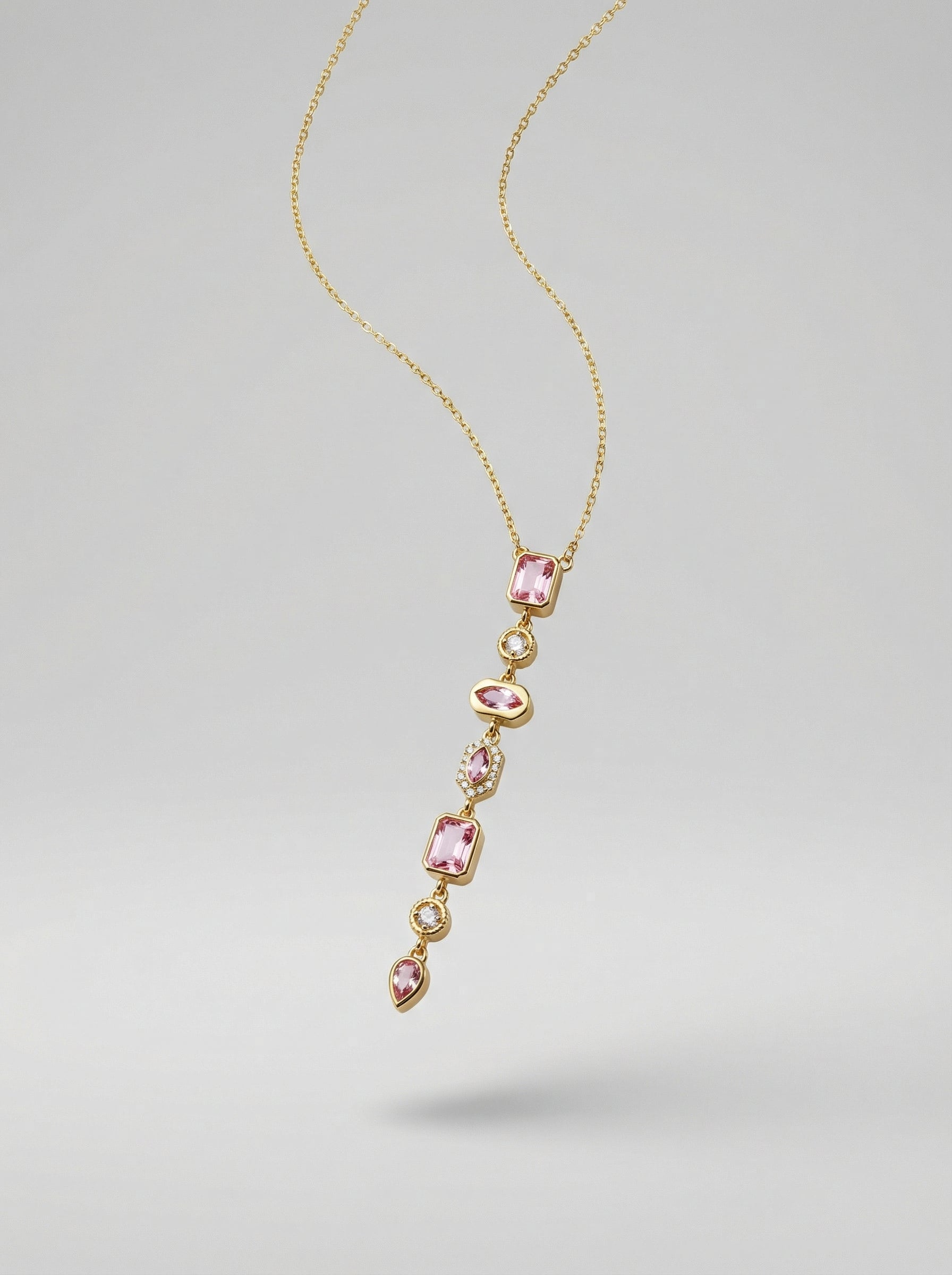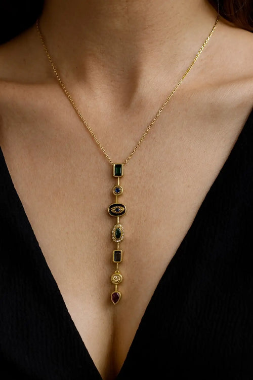 Farklı kesim ve renklerde taşların bir araya gelişi, tek bir çizgide karakterli bir bütünlük oluşturur. Minimal zincir yapısı ise tasarımın düşey siluetini ön plana çıkararak boynu zarif şekilde uzatır ve şıklığı vurgular.